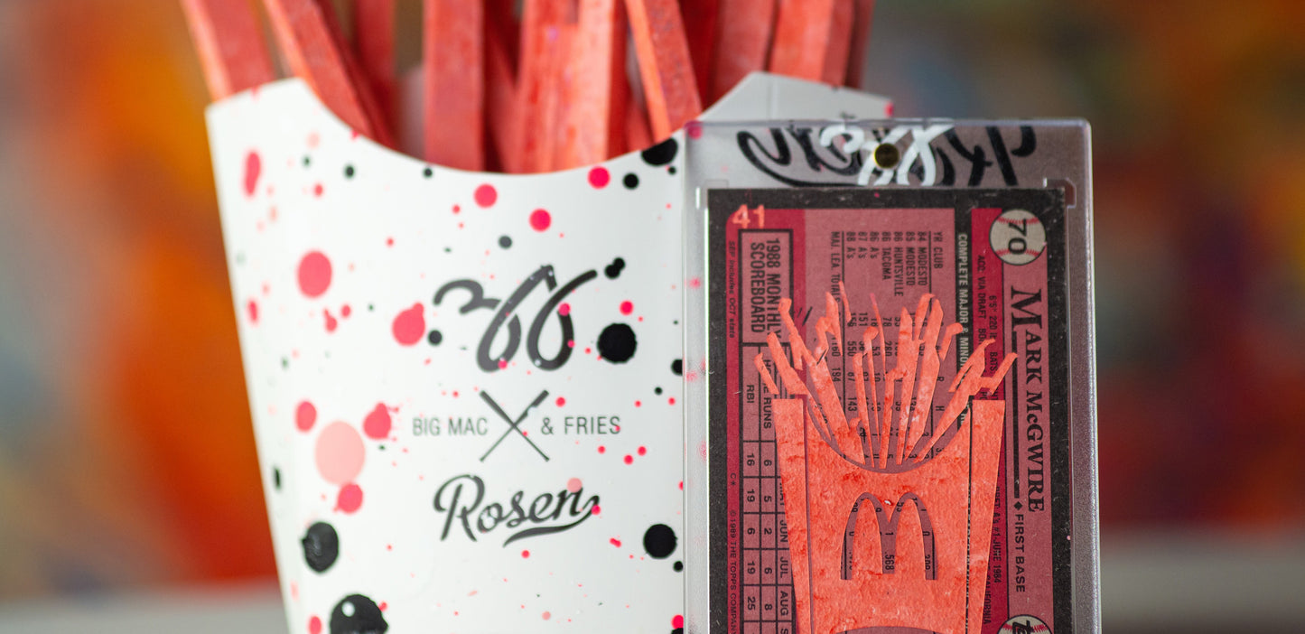 Using a selection of '87-89 Topps, I've painted my McDonald's fries on one side, with Blake doing his splatter paint on the other... and on the french fry carton too! In several color variations, each card comes delivered inside a matching dual-label Ultra Pro and my custom designed carton... signed on the back. Bubble gum fries not included!