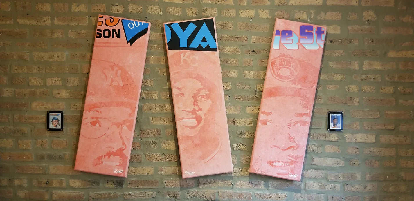 - My gum stick paintings are done on plywood as homage to the game's wooden bats. I hand bevel the wood with a router to create the proper shape, which also captures highlights on the edges and supplies nice drop shadows on the wall.