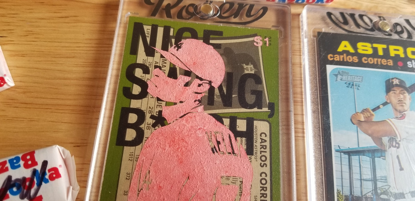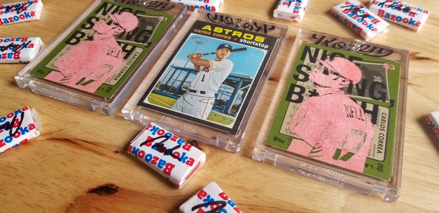 After purchasing some old wax packs to study the size and texture of gum sticks, I developed my own paint techniques in order to replicate it. Now, I hand-paint bubble gum directly onto vintage baseball cards to create small collectibles.